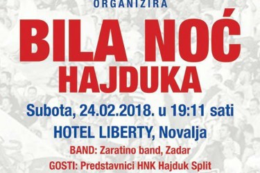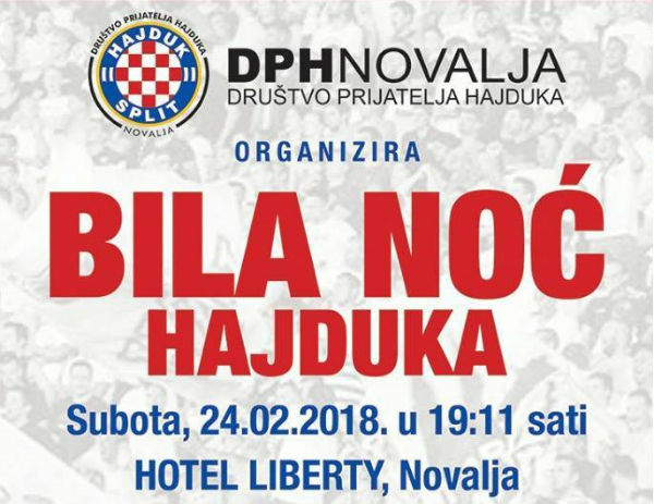 Društvo prijatelja Hajduka Novalja organizira Bilu noć u subotu, 24. 02. 2018. u 19,11 sati u hotelu Liberty, NovaljaDođite i podržite Hajduk