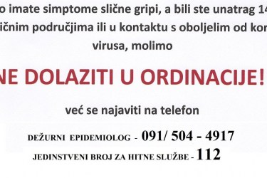 NE ODLAZITE U ZDRAVSTVENE USTANOVE VEĆ PRIJE SVEGA TELEFONOM KONTAKTIRAJTE DEŽURNOG EPIDEMIOLOGA LIČKO-SENJSKE ŽUPANIJE NA BROJ 091 504 4917, JEDINSTVENI BROJ ZA HITNE SLUŽBE 112 ILI SVOG OBITELJSKOG LIJEČNIKA.