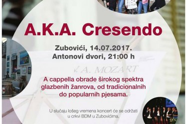 U petak, 14. srpnja 2017.g. zanimljiv nastup Sveučilišne akademske a capella grupe A.K.A. Cresendo očekuje nas u Zubovićima.Koncert će se održati u prostoru Antonovih dvorov u 21.00 sati.Pozivamo Vas da posjetite ovaj zanimljiv koncert.