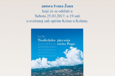 U subotu, 25. ožujka 2017., u svečanoj dvorani općine Kolan, s početkom u 19,00 sati, biti će predstavljena knjiga Tradicijska pjevanja otoka Paga, autora Ivana Žana.
