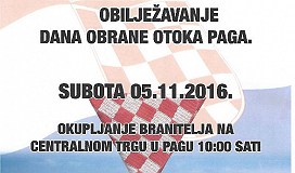 U subotu 5. 11. 2016. g. obilježit će se Dan obrane otoka Paga. 10. 00 - okupljanje branitelja biti će na centralnom trgu u Pagu. 10. 30 - sv. misa za branitelja u crkvi Marijinog uznesenja u Pagu. 12. 00 - svečanost i prigodno druženje na Paškom mostu